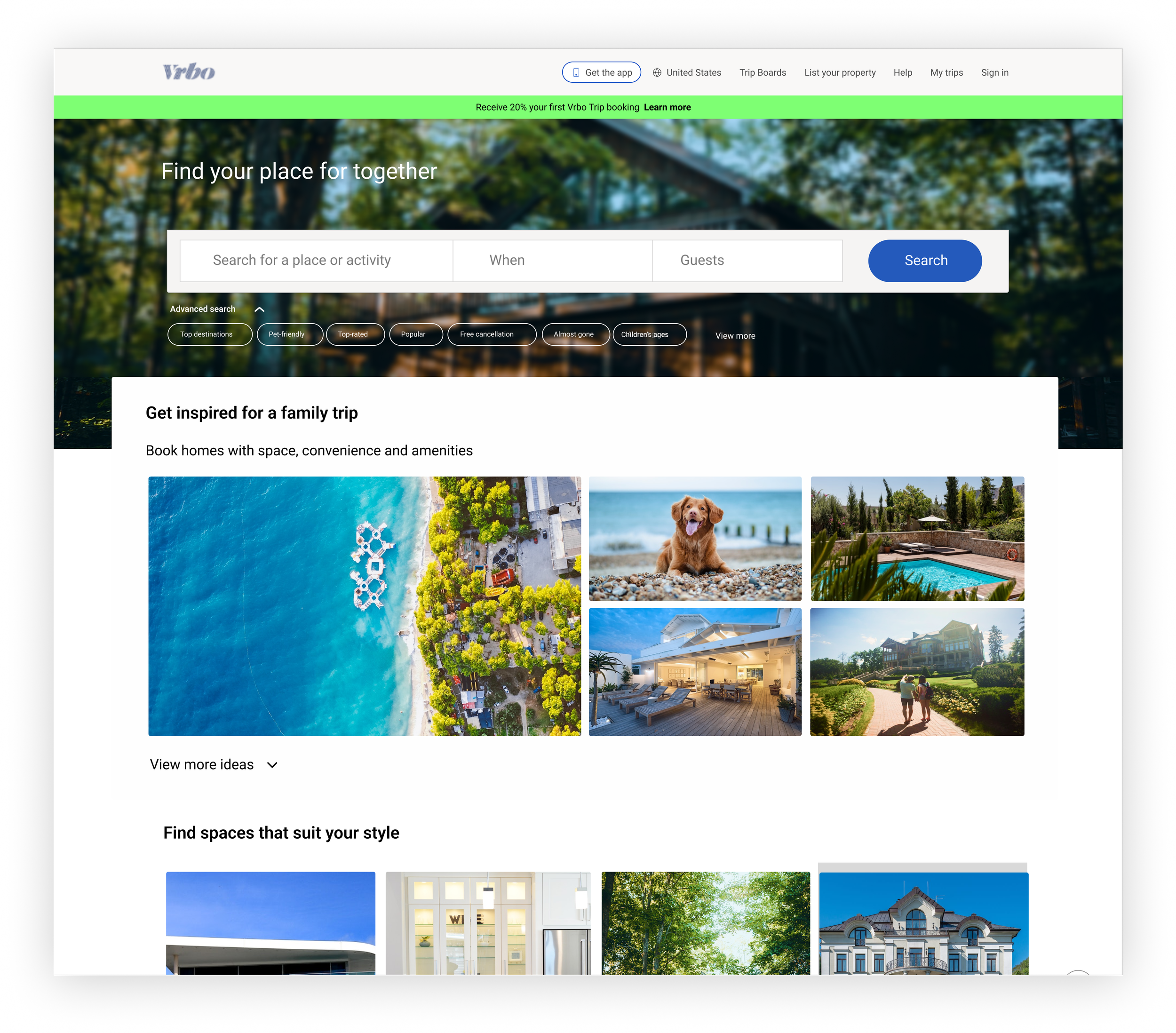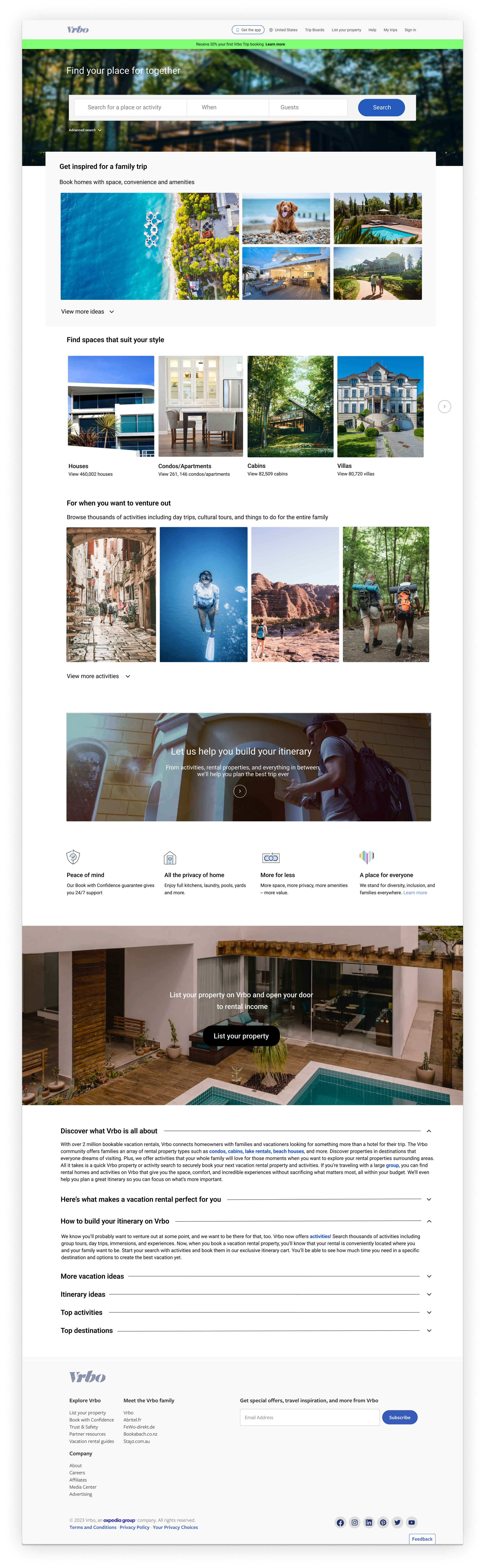 Vrbo is a vacation rental platform that allows users to rent entire properties. VRBO differentiates from competitors by focusing on offering entire property rentals. Their mission is to find every family a space they need to relax, reconnect, and enjoy precious time away together”.