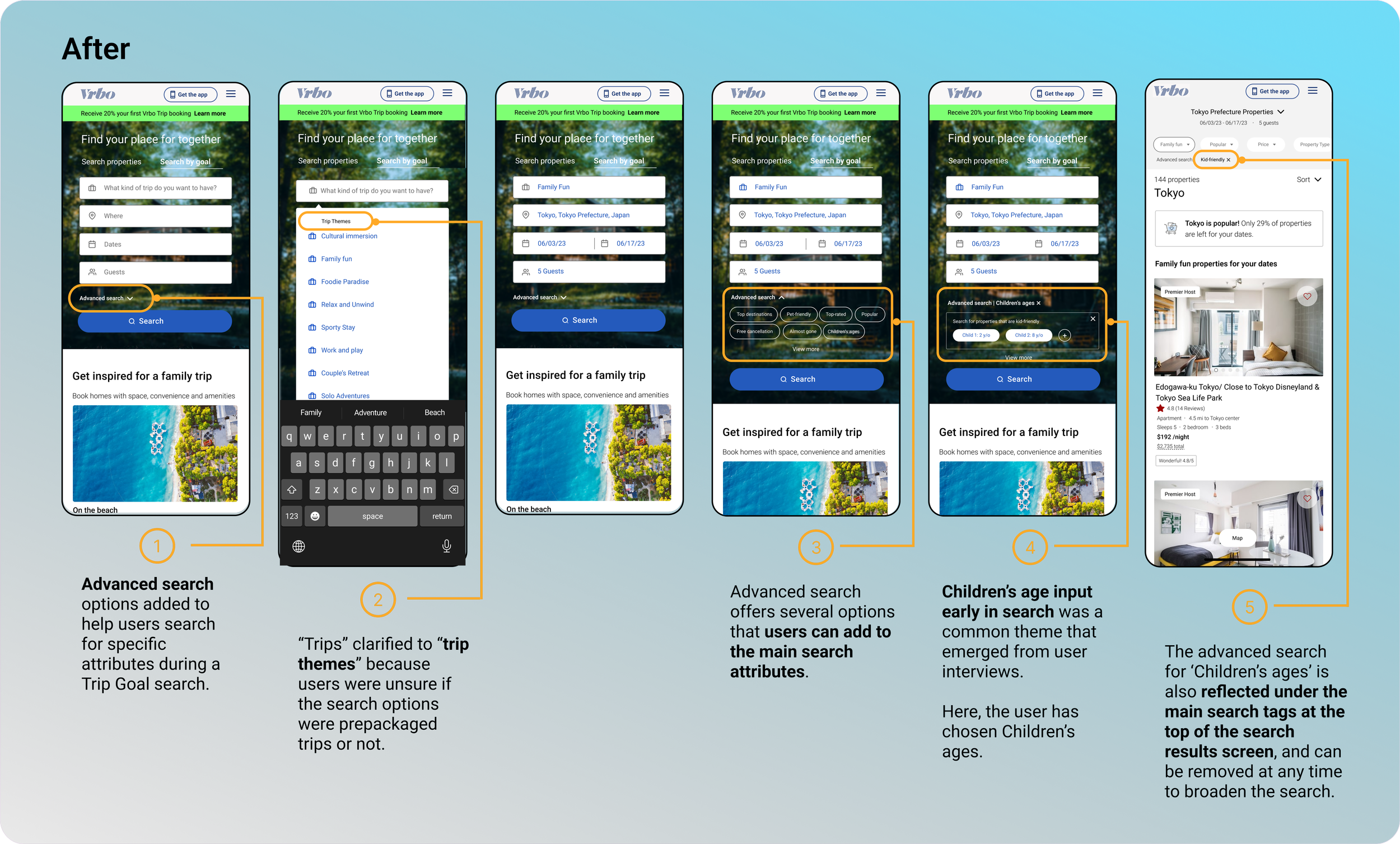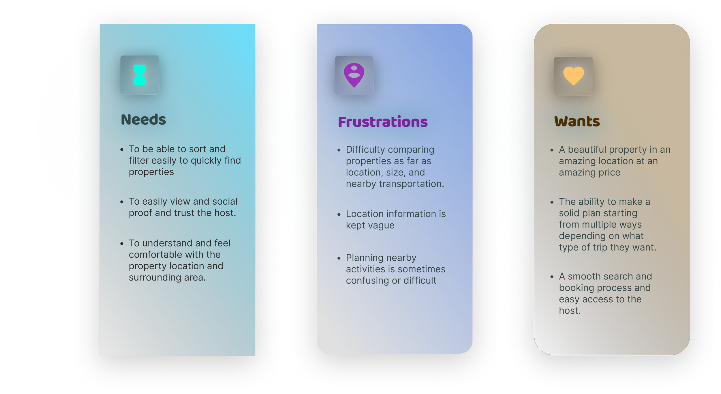 🎯 At this stage, I chose to focus on users with families with family members of different ages since user interviews conveyed that it was the most frustrating scenario when searching for and booking a property rental as well as planning an age-appropriate itinerary.