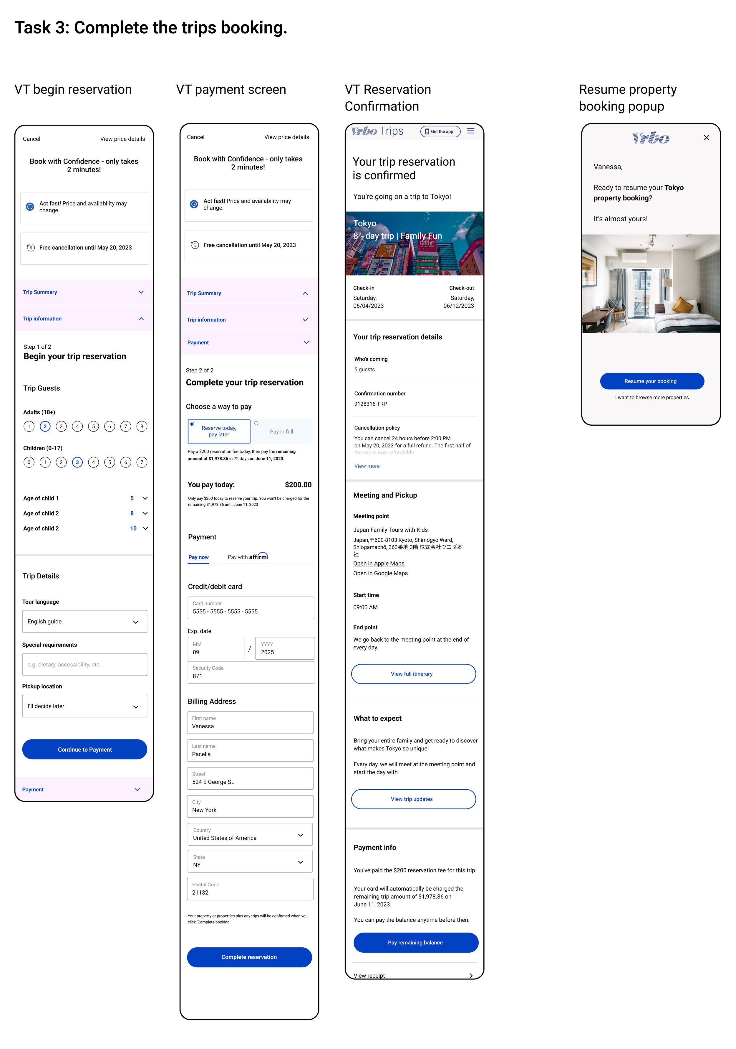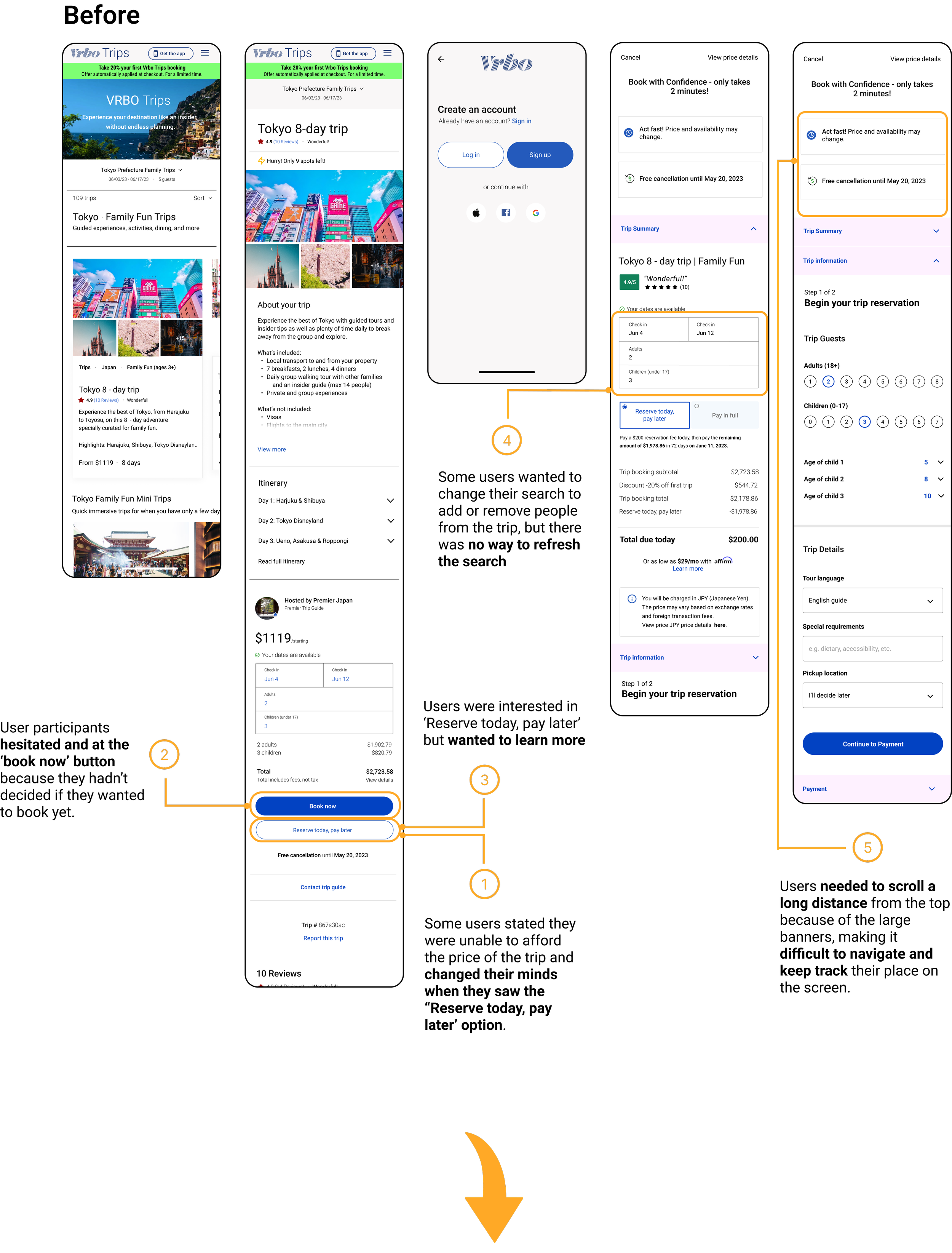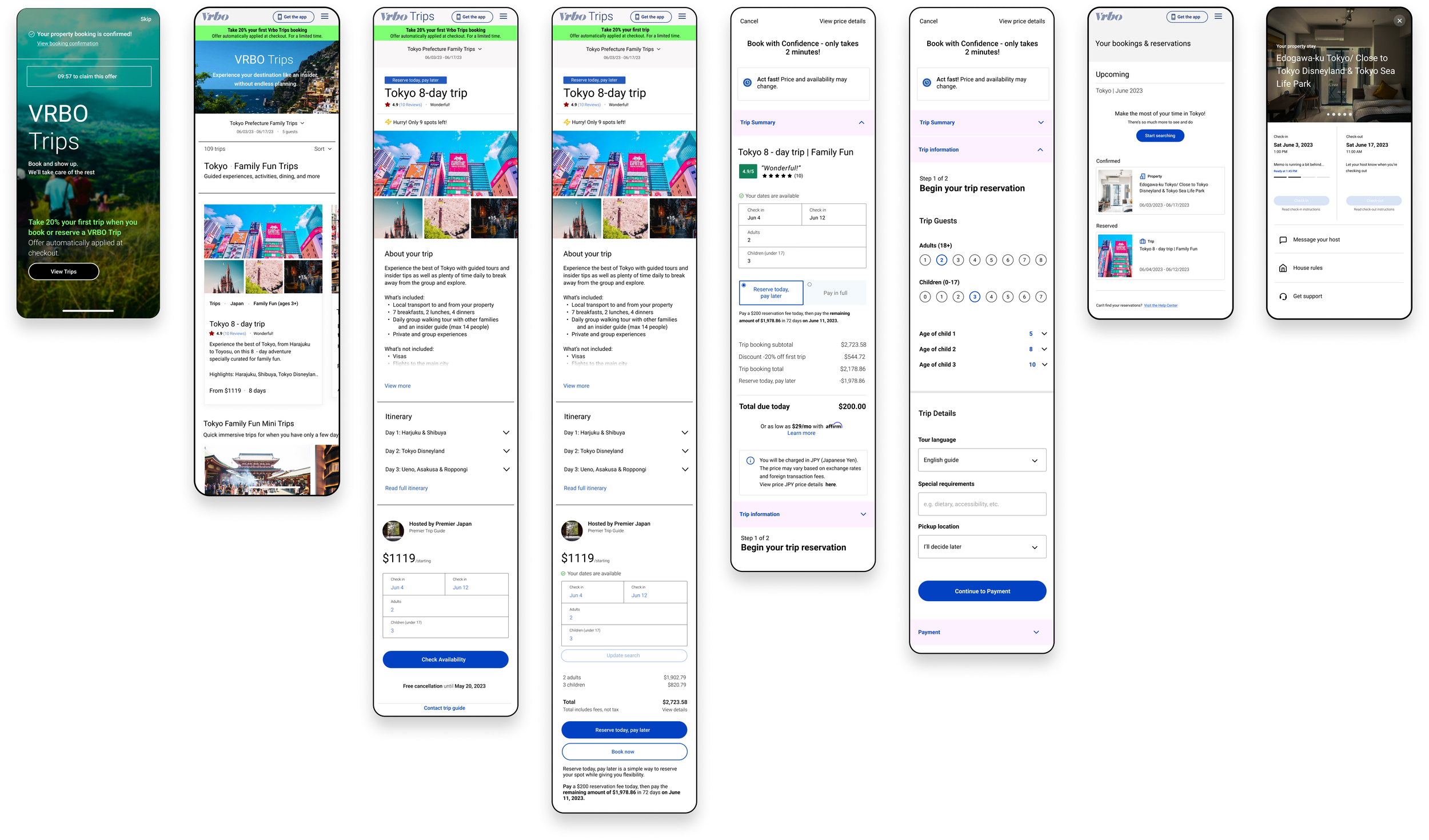 “You’ve decided to view and book a Vrbo Trip. View the Vrbo Trip home screen for first impressions. Then, I’d like for you to select ‘Family Fun’ trips, choose the Tokyo 8-day Trip, and continue on to the reservation process. Again, I’ll give you a moment, and please talk through your thinking as you go.”