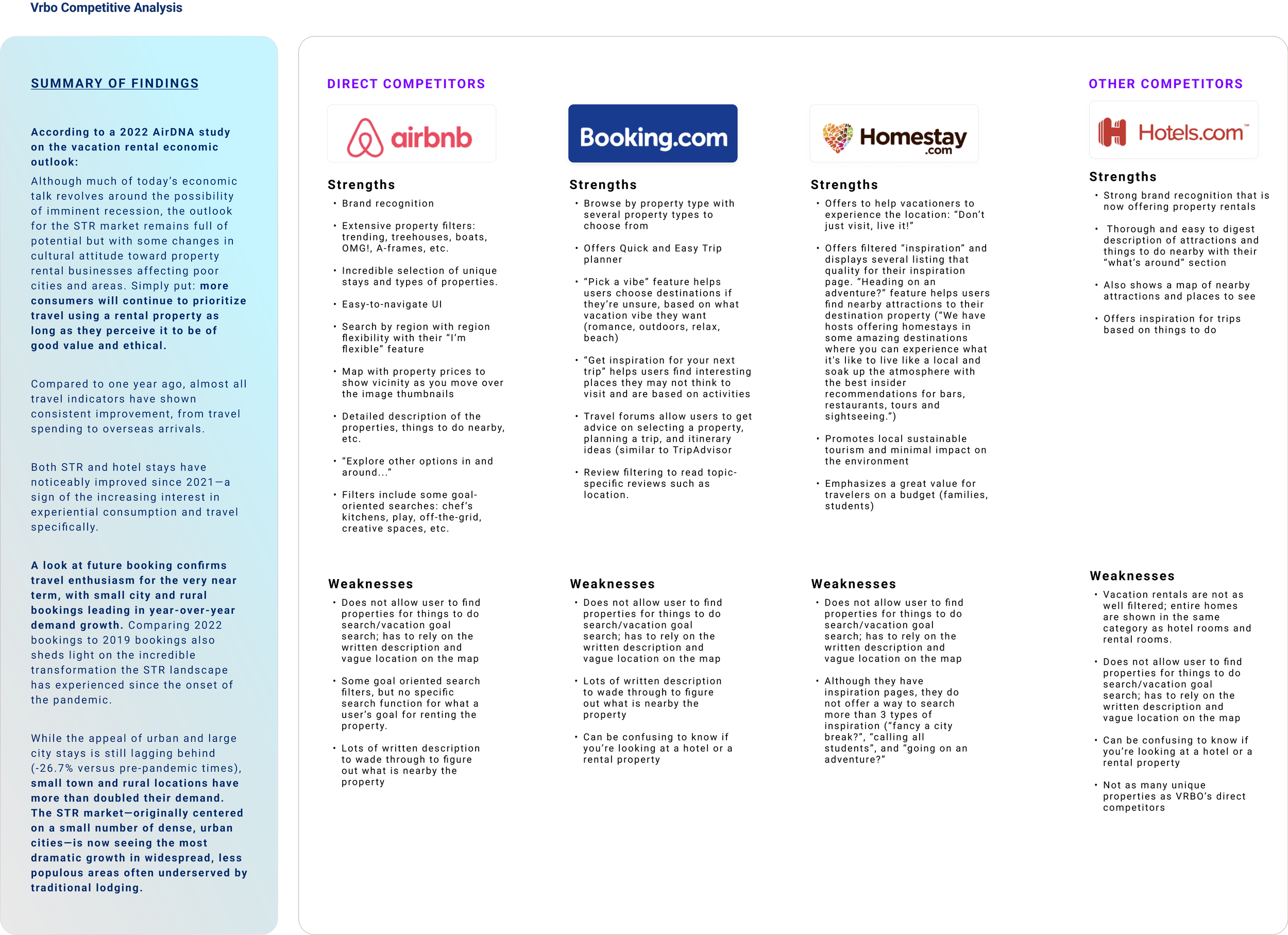 I analyzed the companies’ weaknesses and strengths to understand the general features Vrbo needs to keep track of and innovate upon. I also noted opportunities Vrbo could consider to better differentiate themselves within the property rental space.