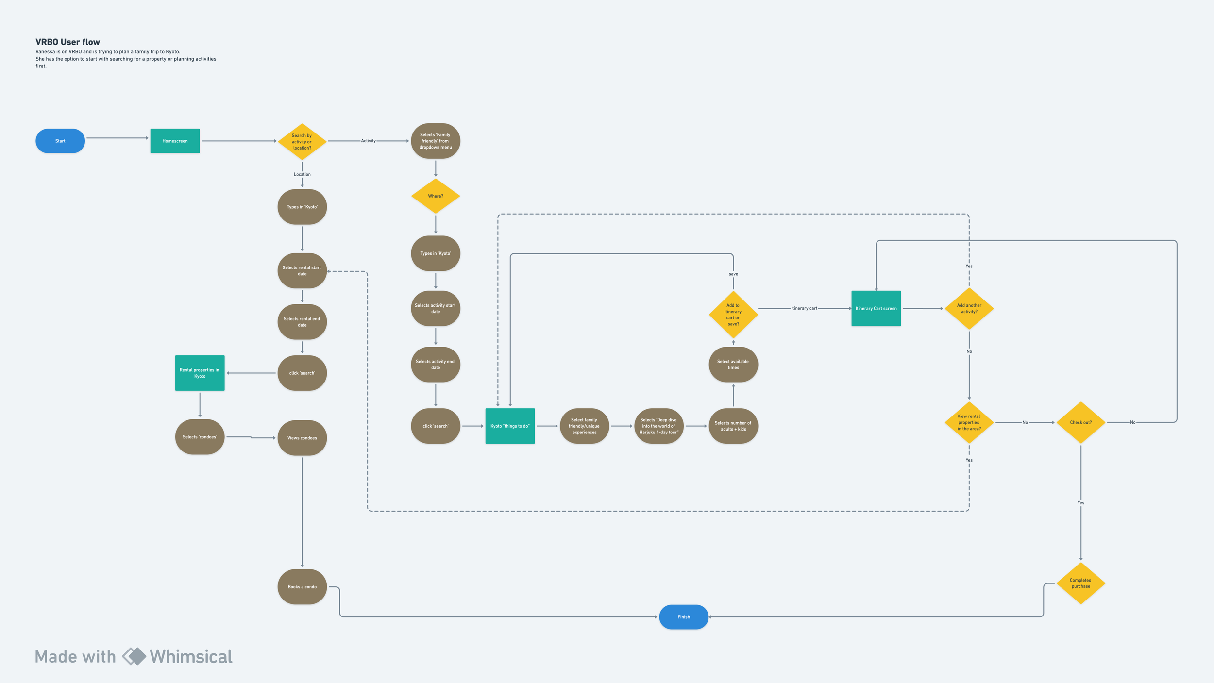The user flow empathizes with my user persona to map out all possible entry points, scenarios, options, dependencies, and outcomes for new, inexperienced property booking shoppers.