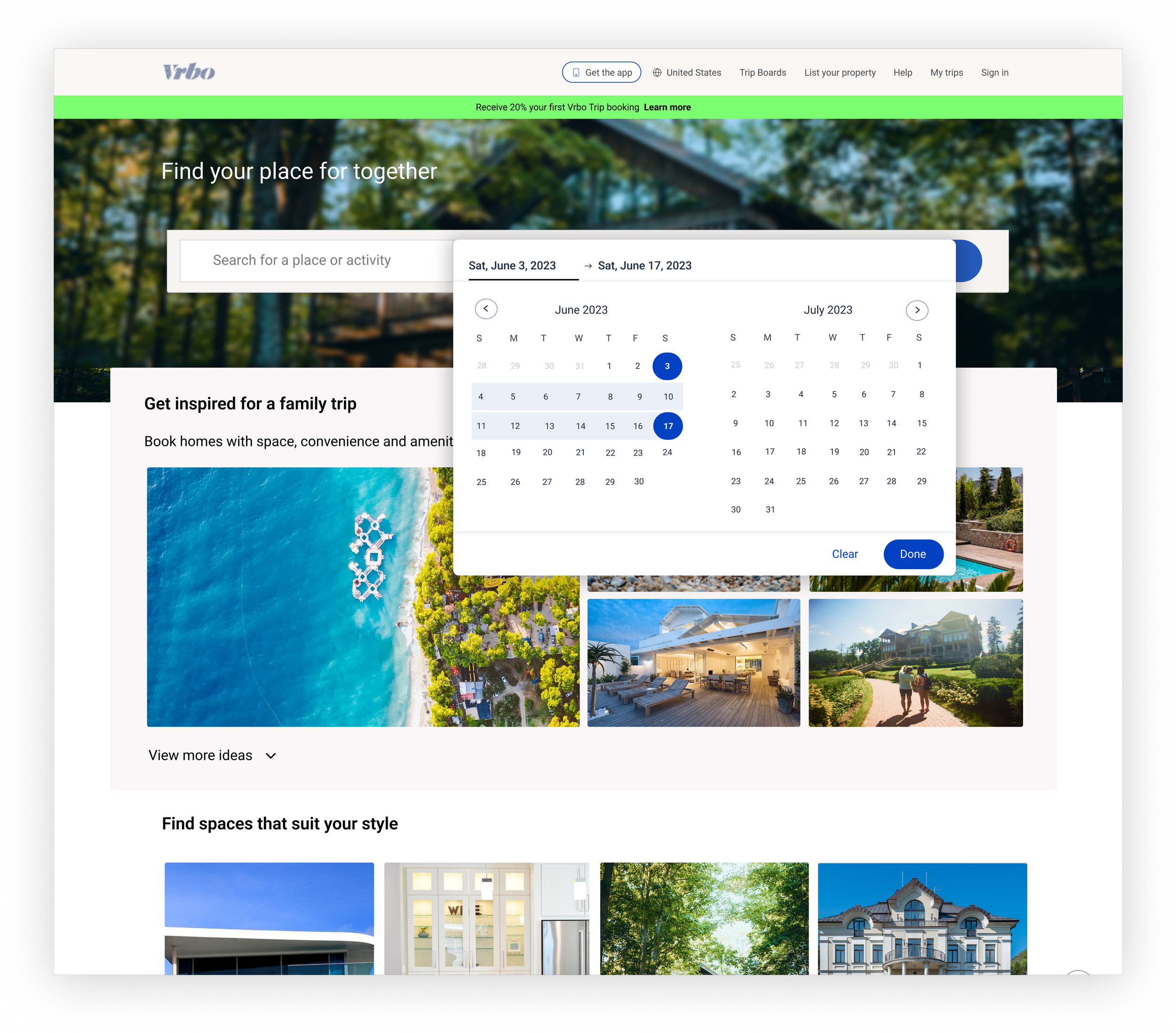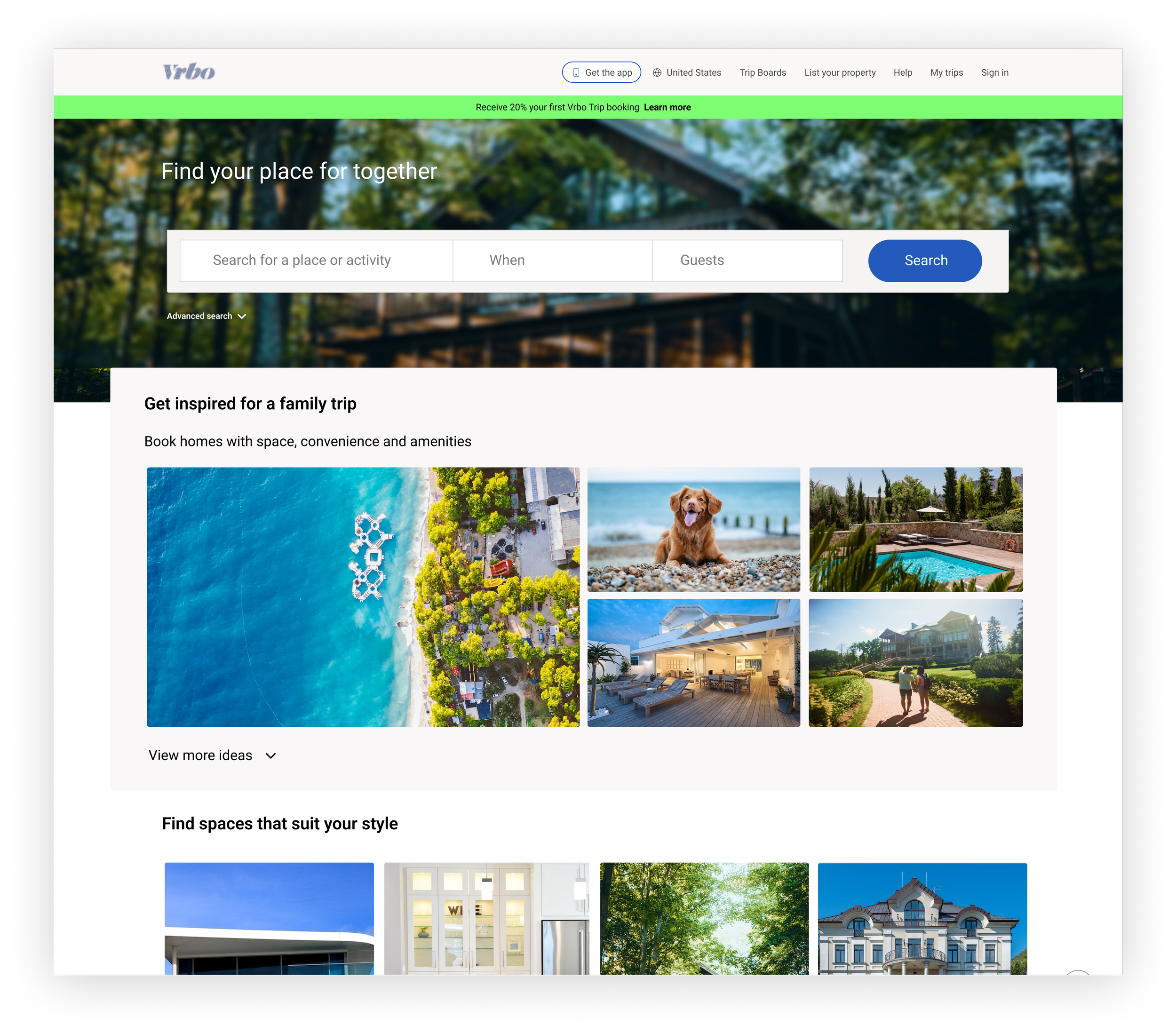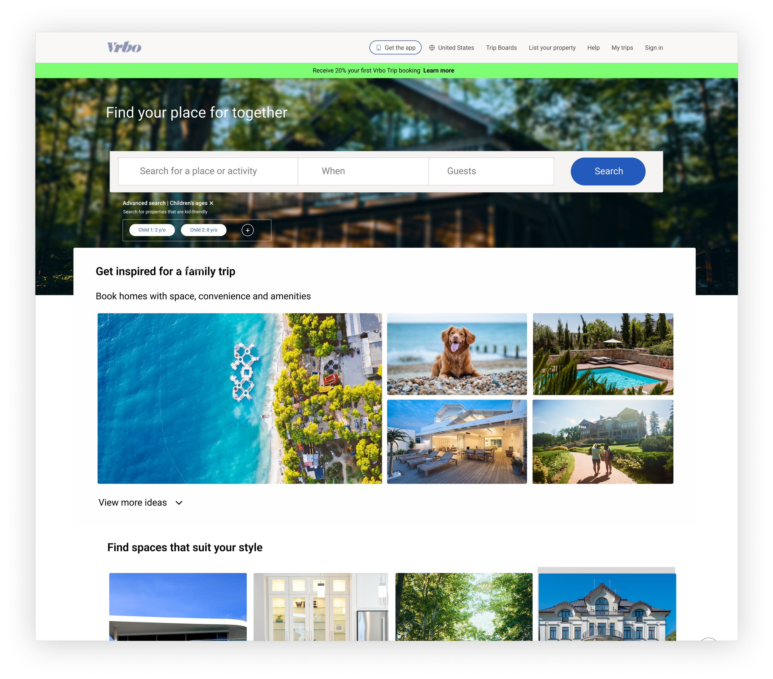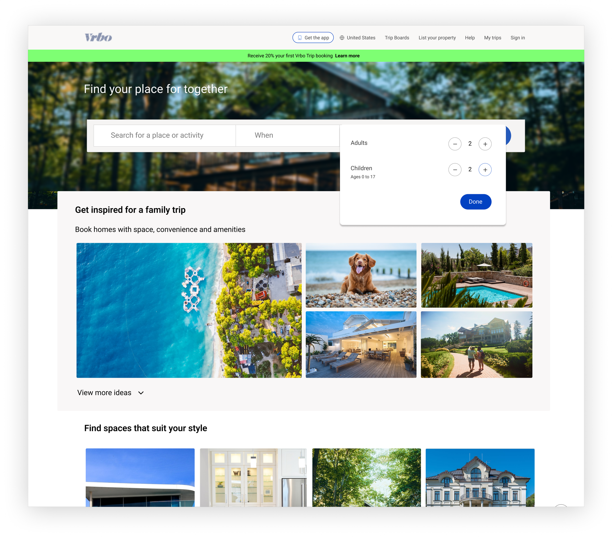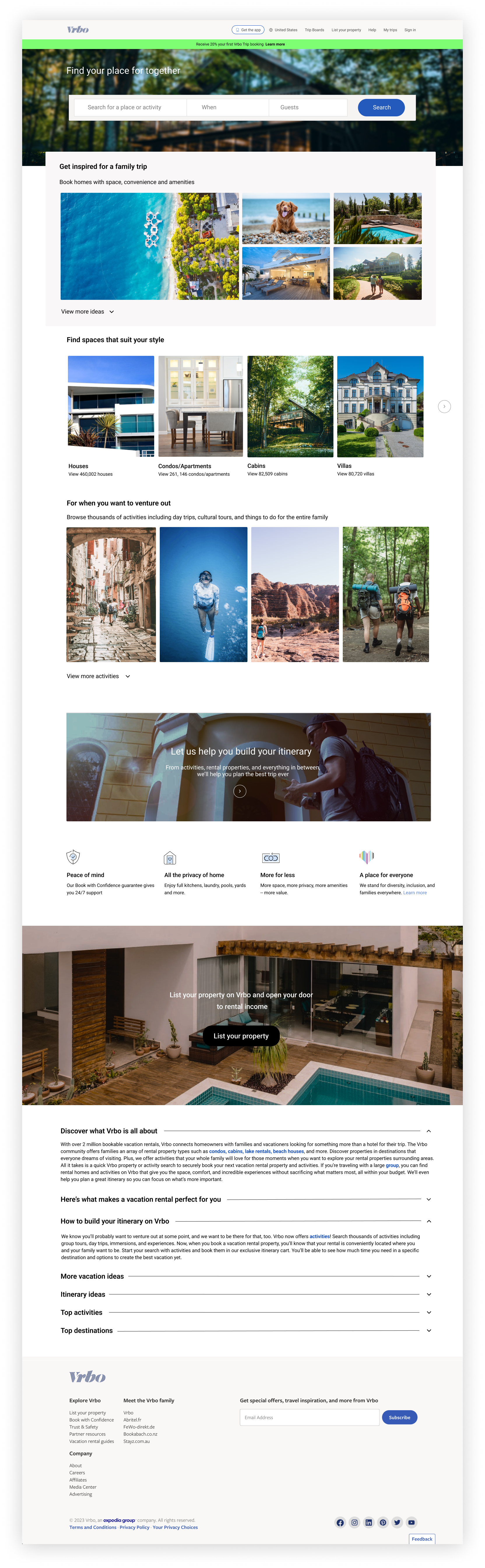 Task 1: User exploration of the Vrbo mobile website, search by goal for a ‘Family fun’ trip, and book the trip.